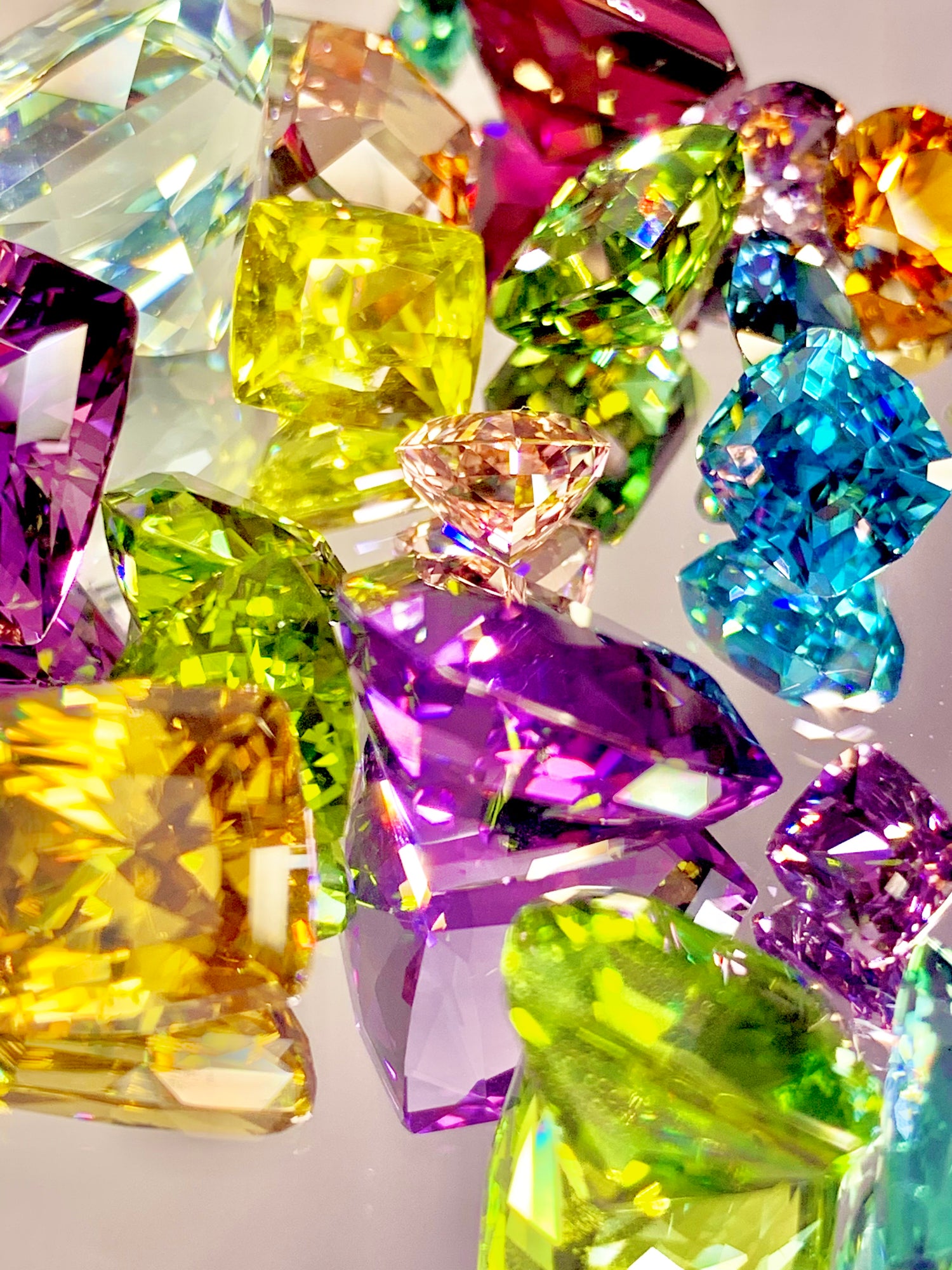 One-of-a-kind colored gemstones cut by Clay Zava, using proprietary and classic designs.
